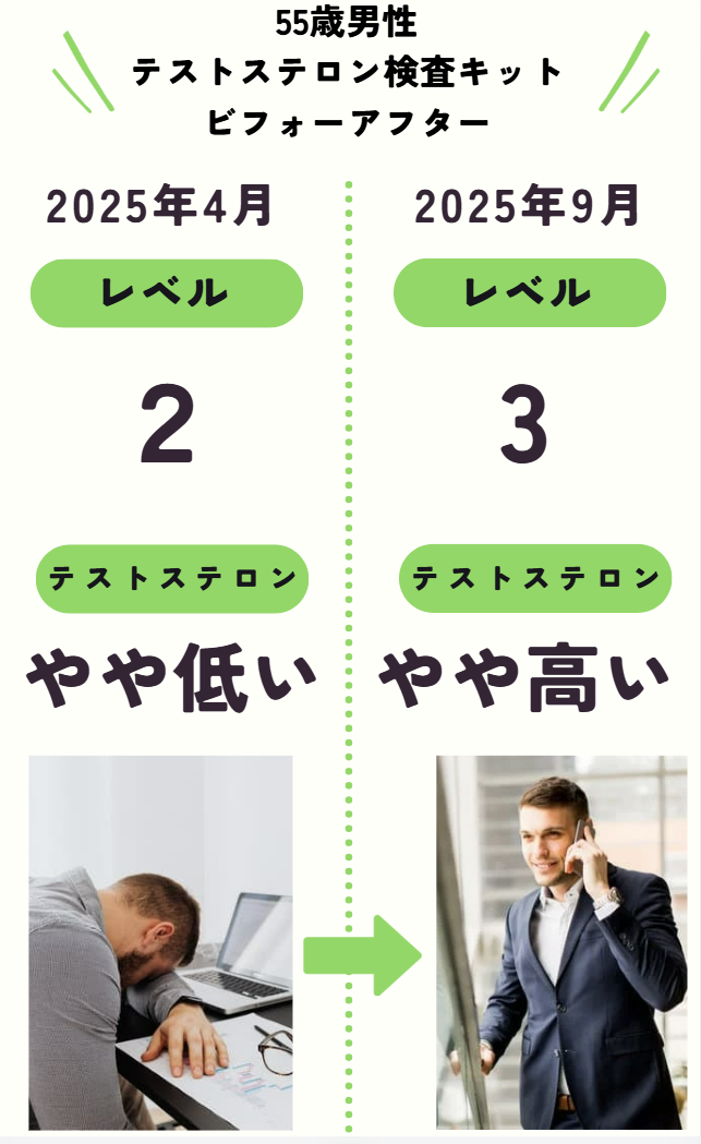 (テストステロン検査/55代男性 / 会社員)「 以前は朝立ちが全くなく、「 男として終わった...」と自信を喪失していました。 マッキーさんの動画で勉強し、まずは現状を知ろうと検査キットを購入。 自分の数値が平均より低いことを知って愕然としましたが、そこから対策を始めたところ、 2ヶ月ぶりに朝の元気を取り戻しました! 数値が上がったのも嬉しいですが、妻との夜も積極的になれそうな自信がついたのが一番の収穫です。」